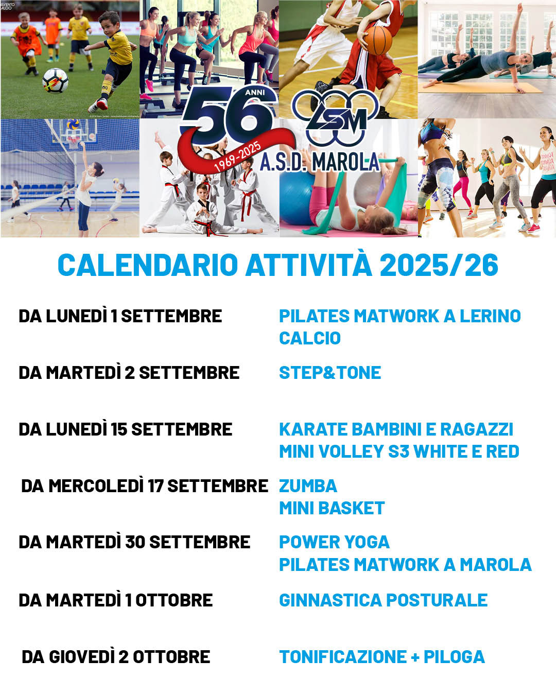 L’Associazione Sportiva Dilettantistica Marola propone le seguenti attività, in un’offerta al passo coi tempi e in continuo aggiornamento: Calcio, Pallavolo, Basket, Karate, Zumba, Pilates Matwork, Power Yoga, Ginnastica posturale, Step & Tone e Tonificazione + Piloga, attività motorie per tutte le età, dai bambini agli adulti, che nonostante il poco tempo libero vogliono divertirsi mantenendosi in forma.