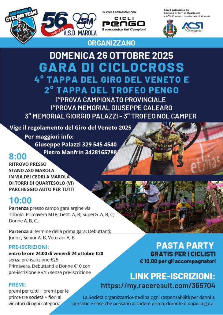L’A.S.D. Marola Cycling Team, in collaborazione con Cicli Pengo e con il patrocinio del Comune di Torri di Quartesolo e del Comitato Provinciale ACSI Vicenza, organizza una grande giornata di ciclocross domenica 26 ottobre 2025.